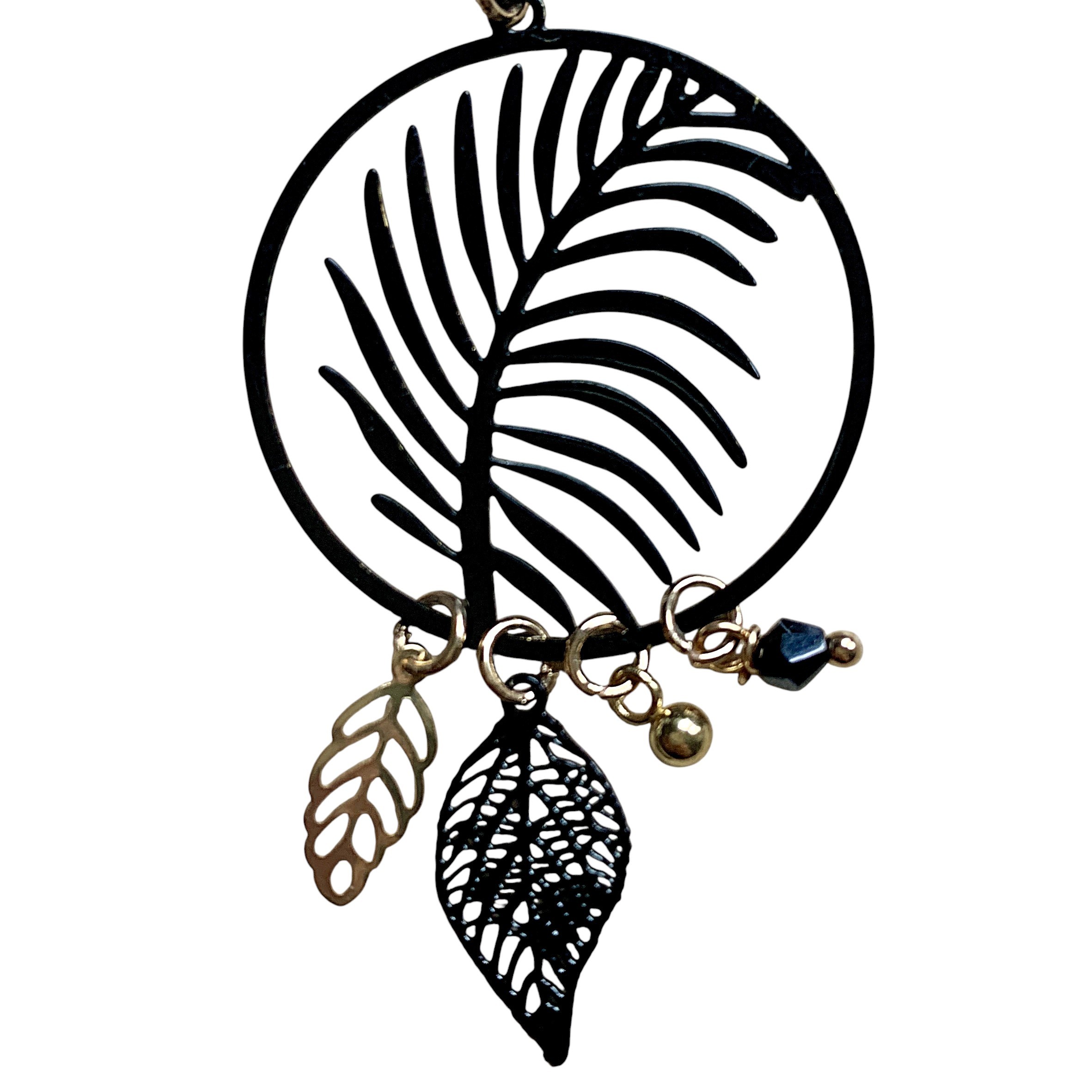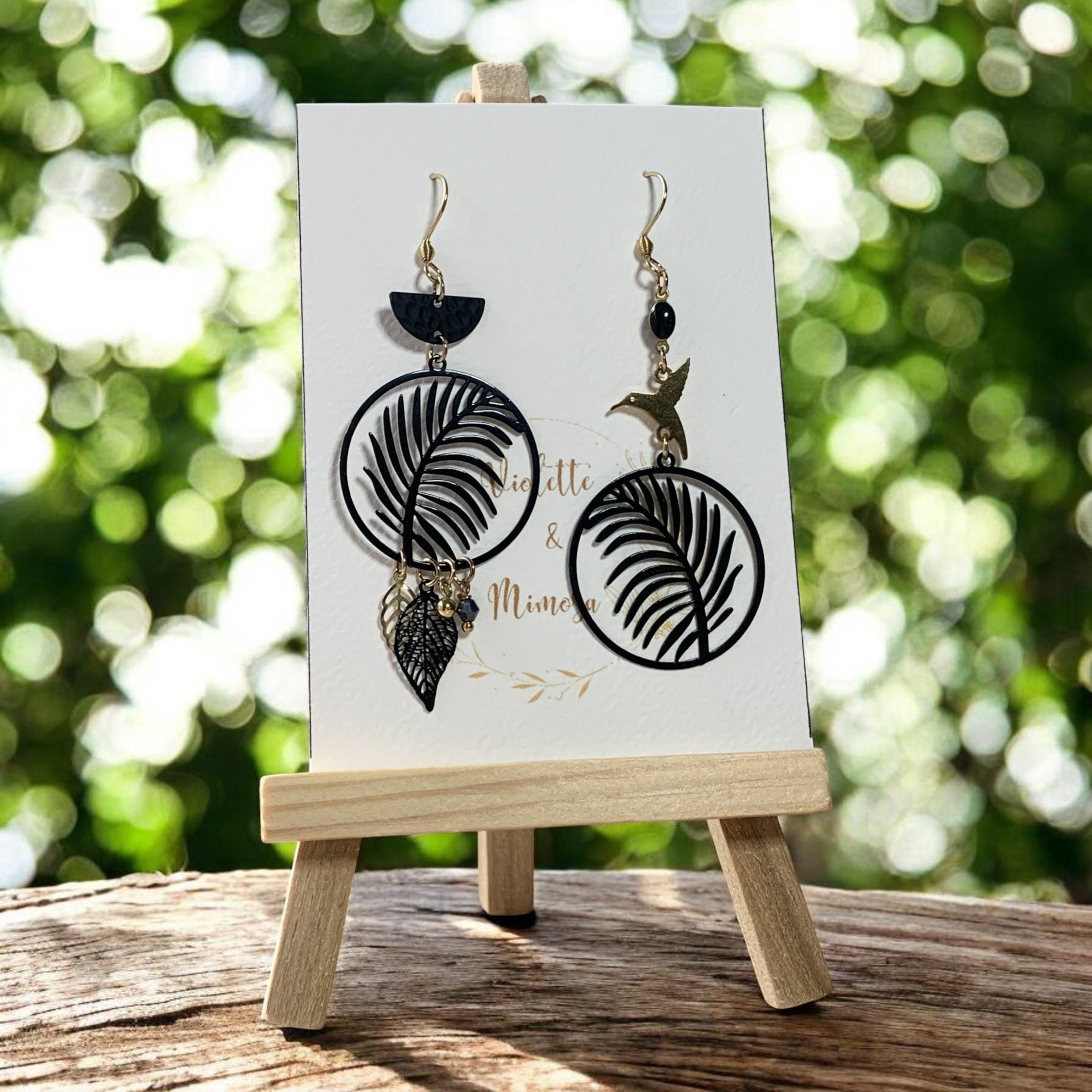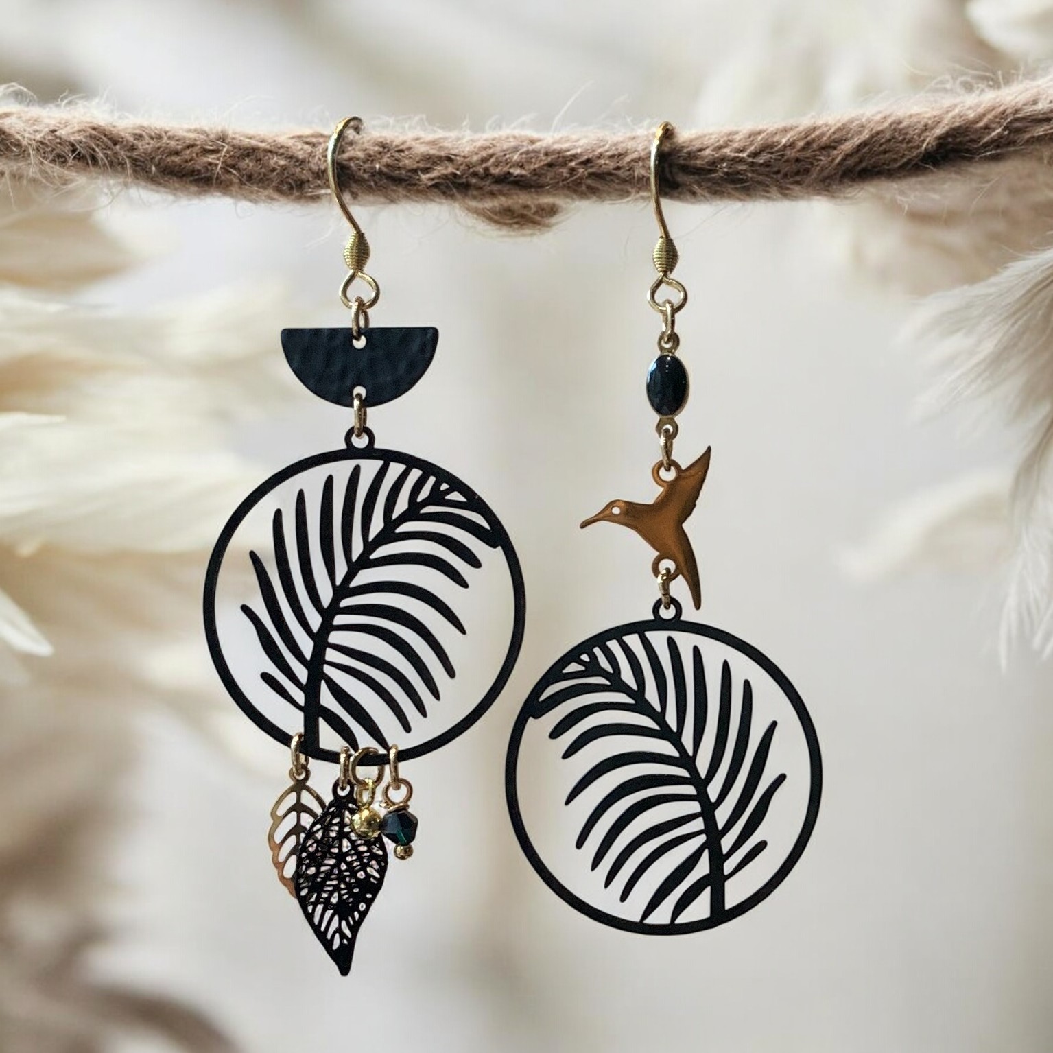 Un modèle original qui attire le regard avec son joli colibri doré qui contraste joliment avec les grandes feuilles noires et ses jolies pampilles