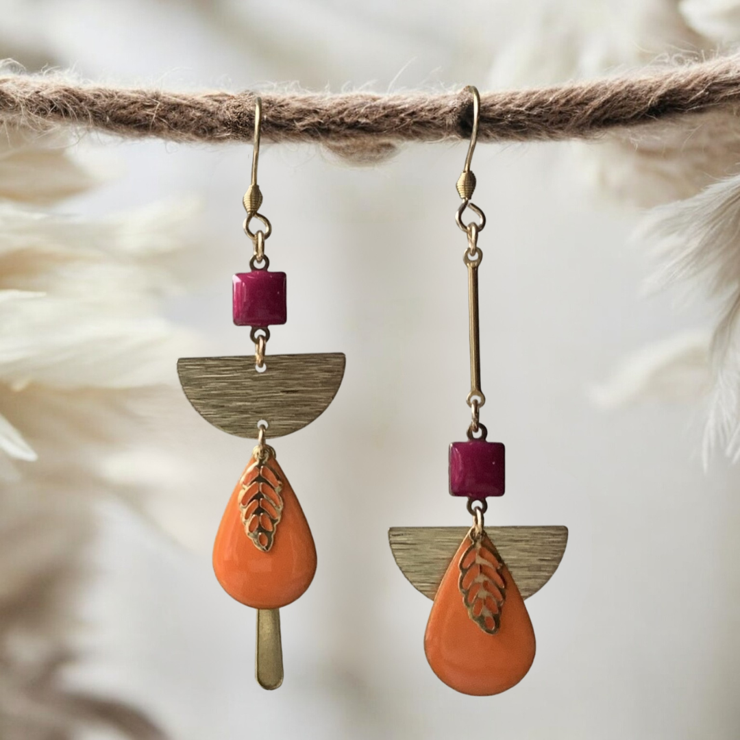 Boucles d'oreilles bohème chic asymétriques dépareillées doré gouttes orange et sequins magenta