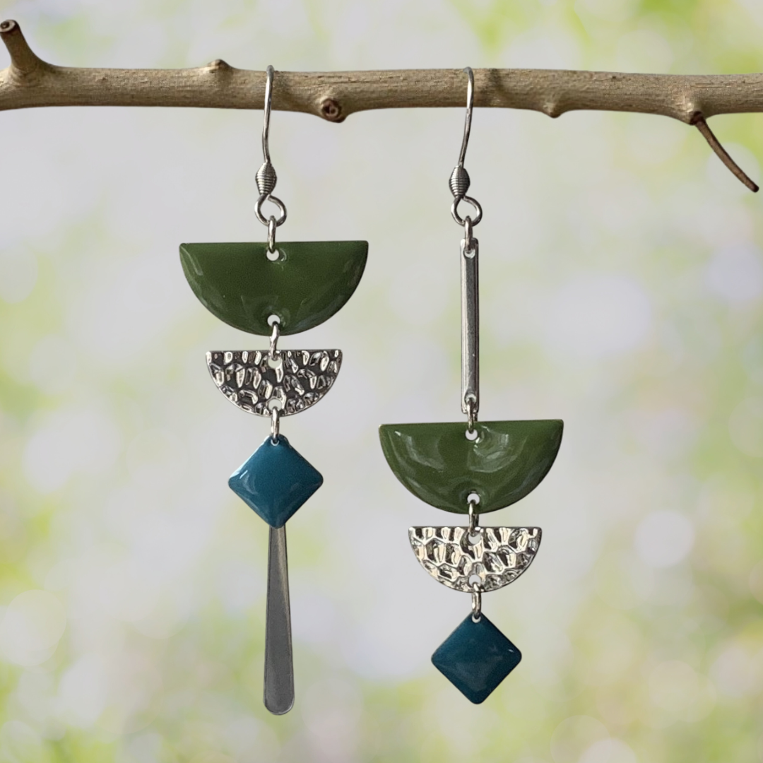 Boucles d'oreilles bohème chic asymétriques épurées kaki et bleu pétrole