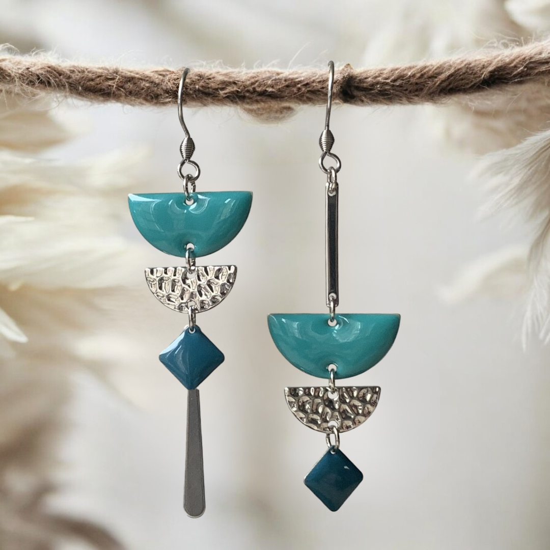 Boucles d'oreilles bohème chic asymétriques épurées sarcelle foncé et bleu pétrole