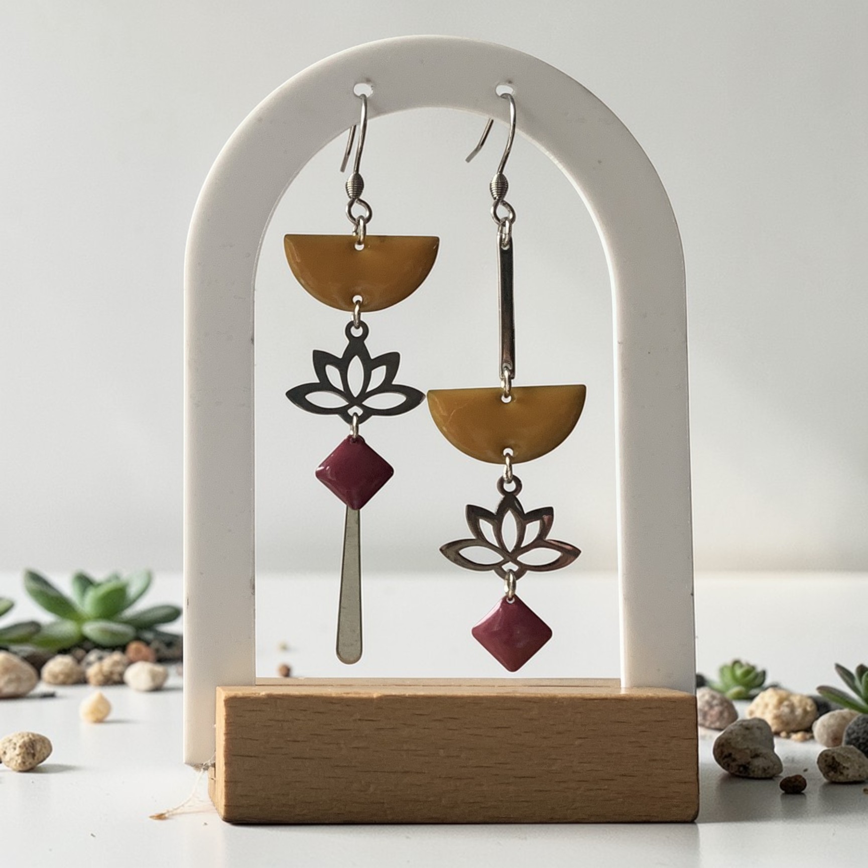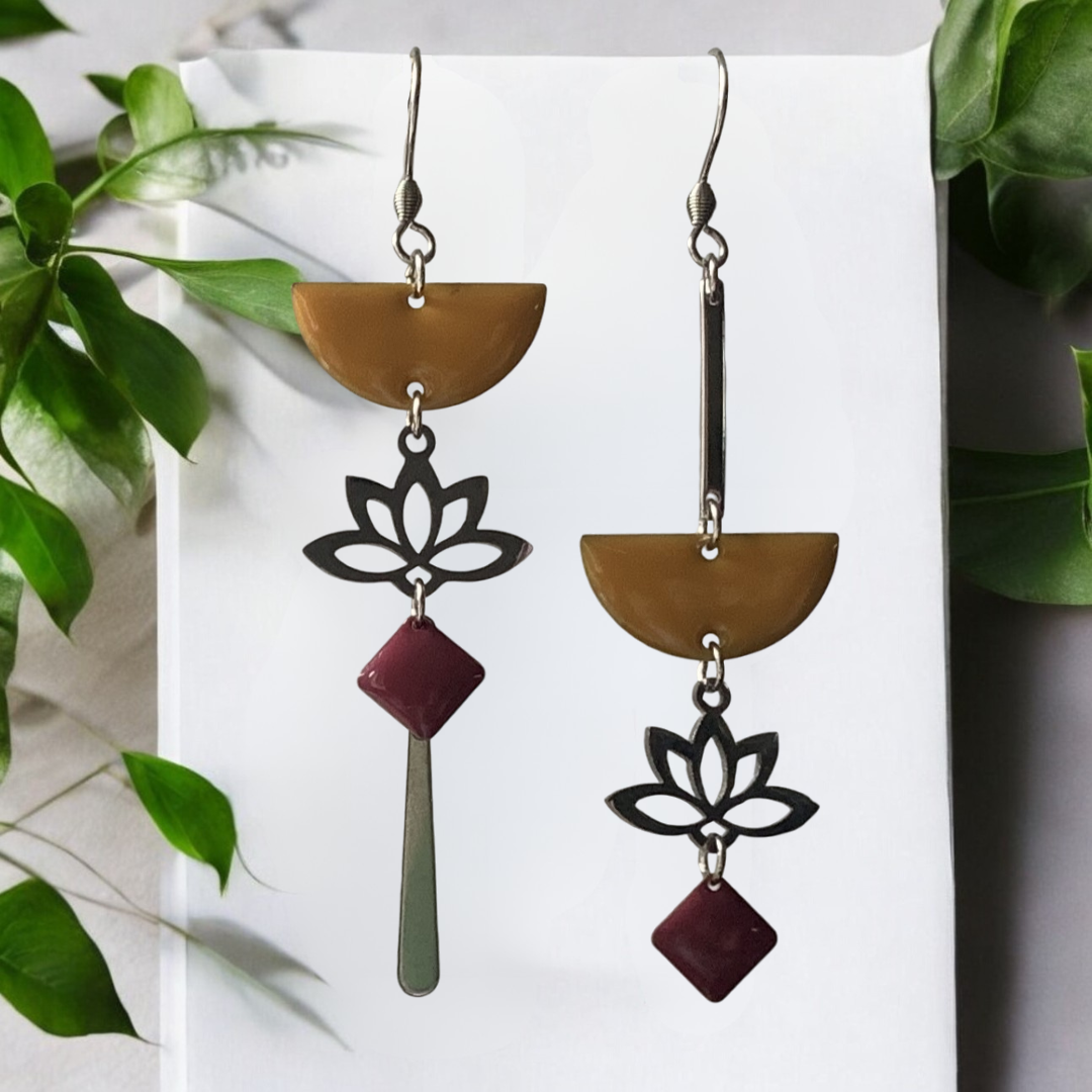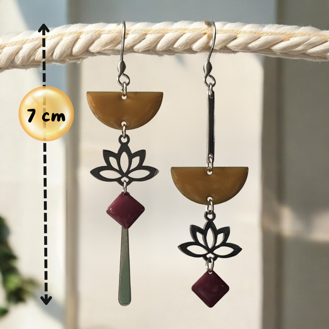 Boucles d'oreilles bohème chic asymétriques argentées moutarde et bordeaux