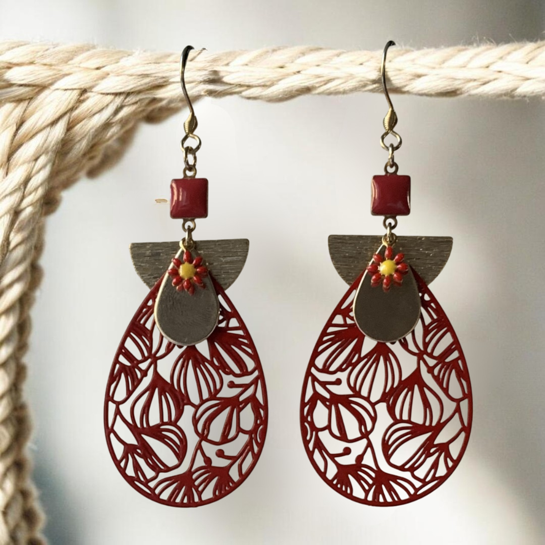 Un modèle rouge et doré qui met en valeur une magnifique goutte rouge aux motifs ouvragés.