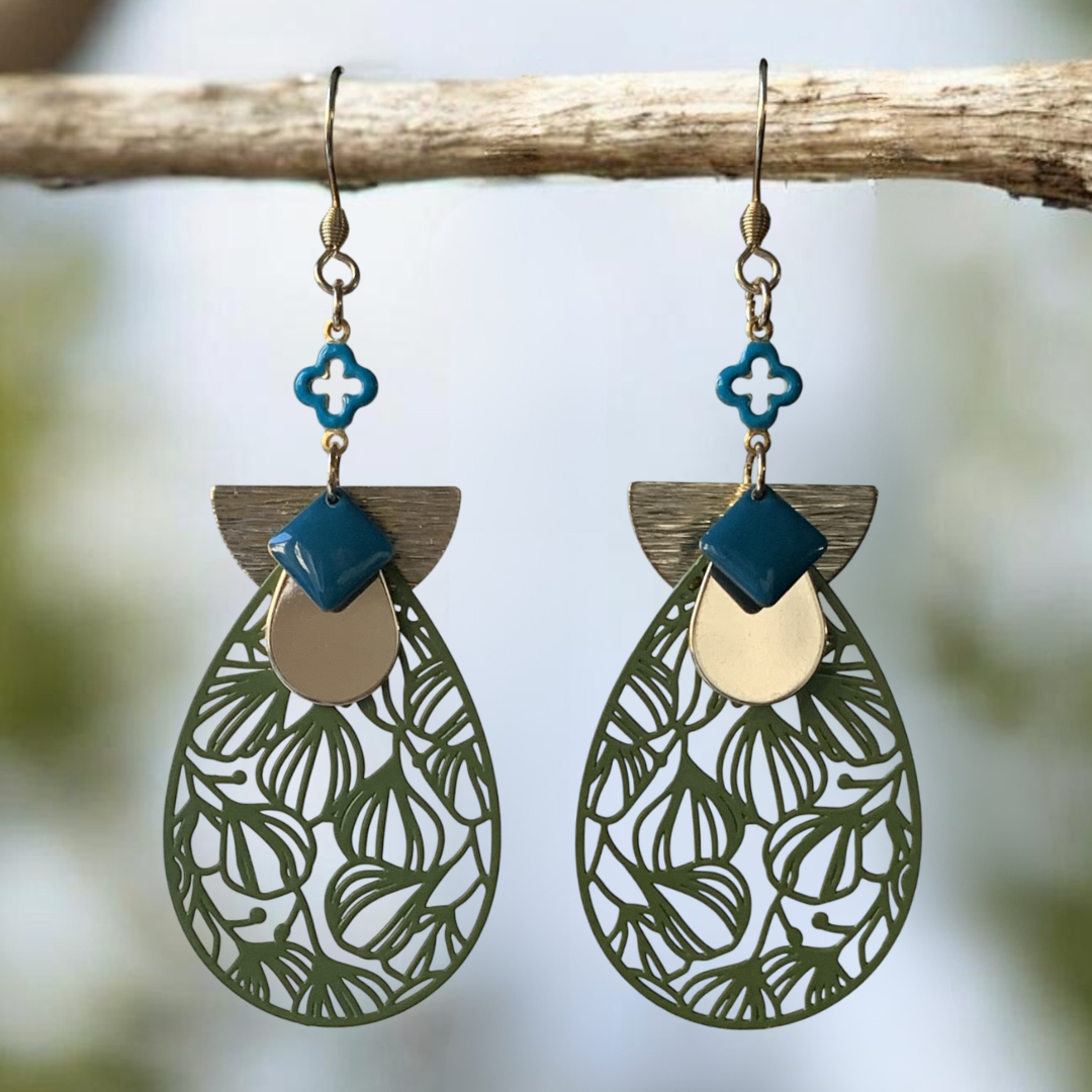 Une goutte kaki ouvragée mise en valeur par le contraste du bleu pétrole