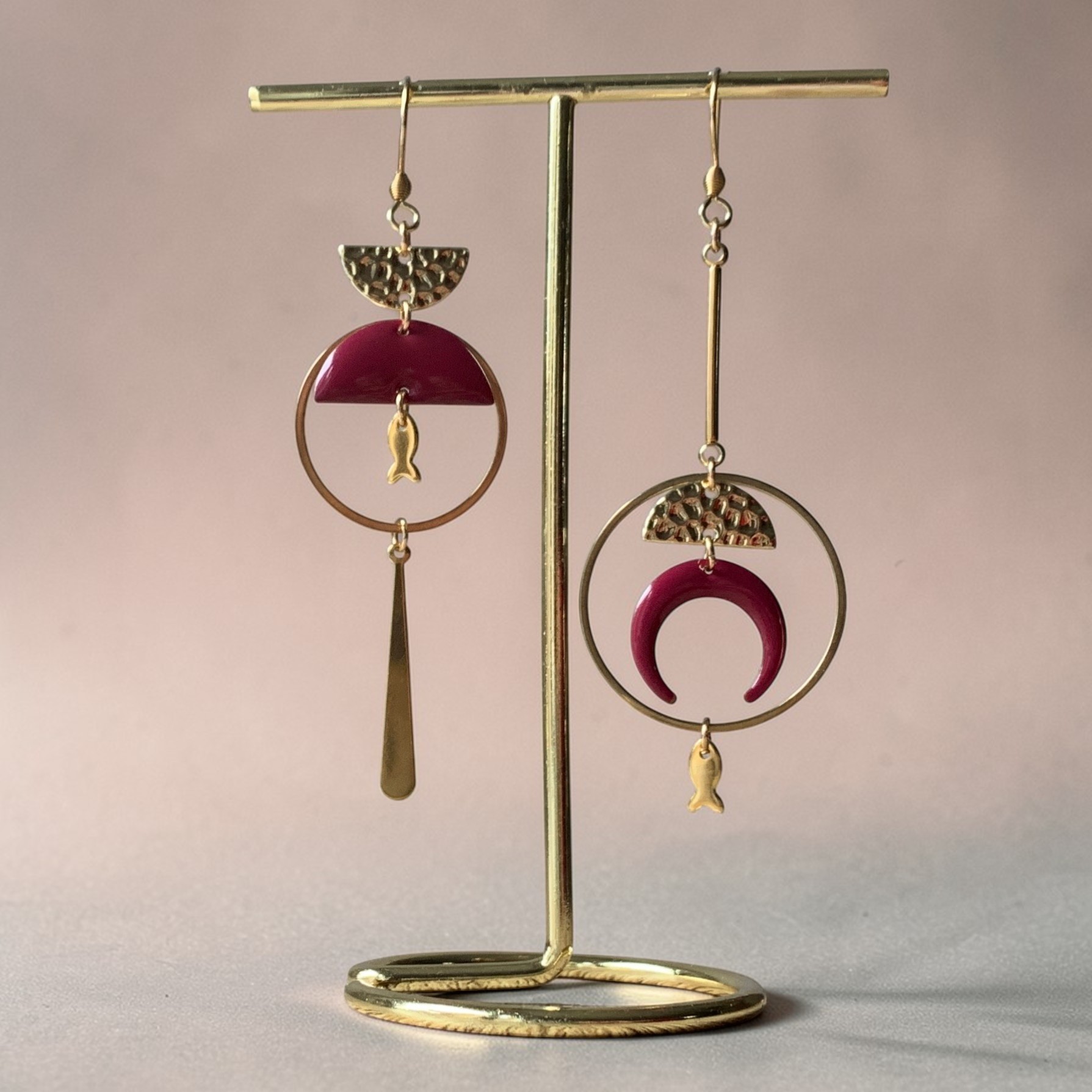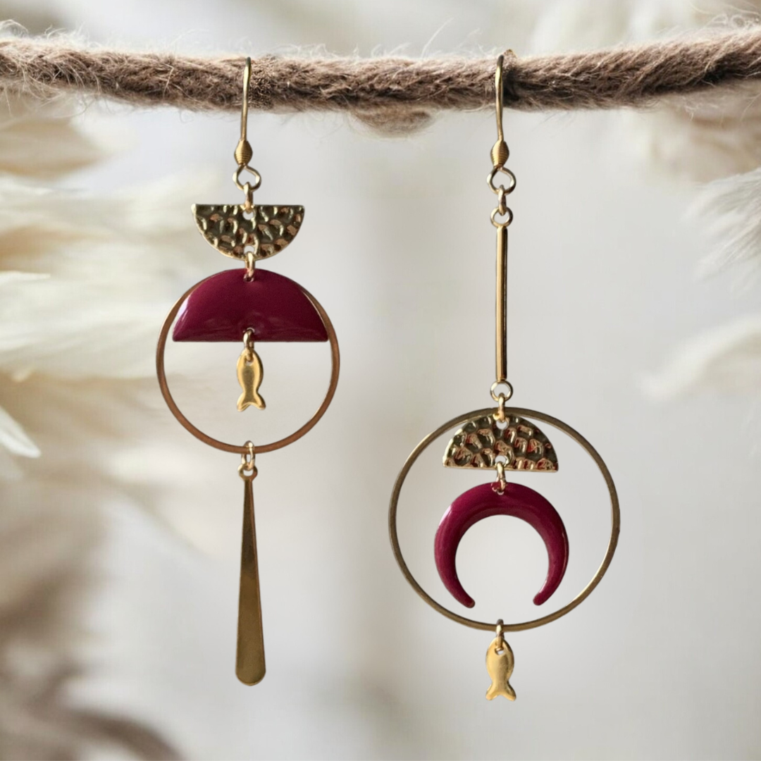 Les autres pièces sont en acier inoxydable, alliage de zinc pour les demis ronds dorés martelés et sequins émaillés lune et demi-rond bordeaux