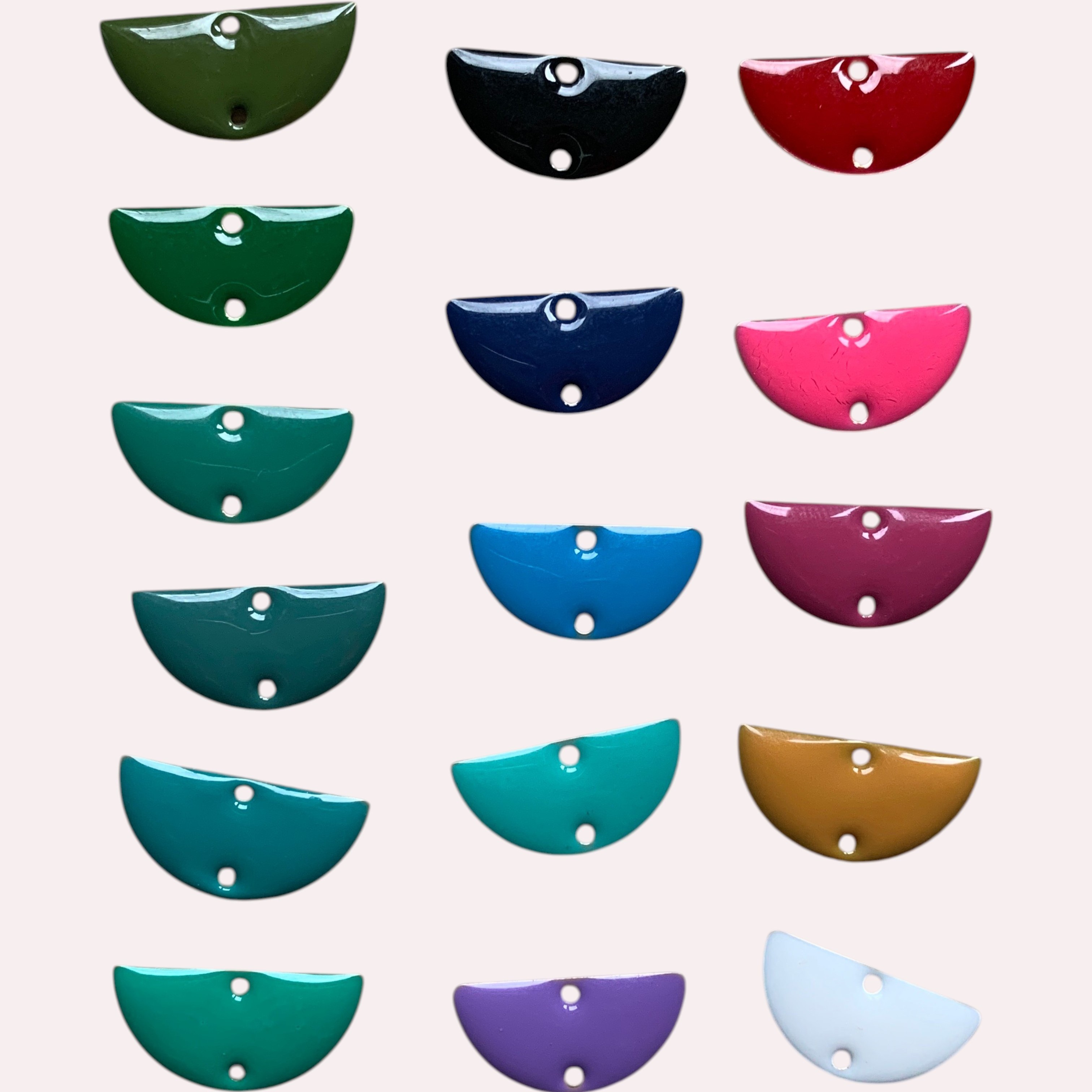 Tous les éléments de ce modèle sont en acier inoxydable et sequin émaillés, sauf le demi rond martelé en alliage de zinc doré.