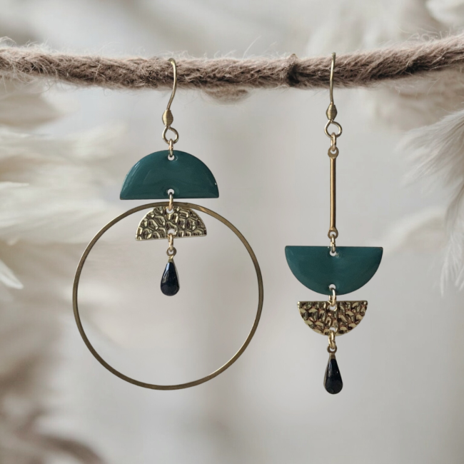 Boucles d'oreilles bohème chic asymétriques dépareillées anneau doré vert et goutte noire