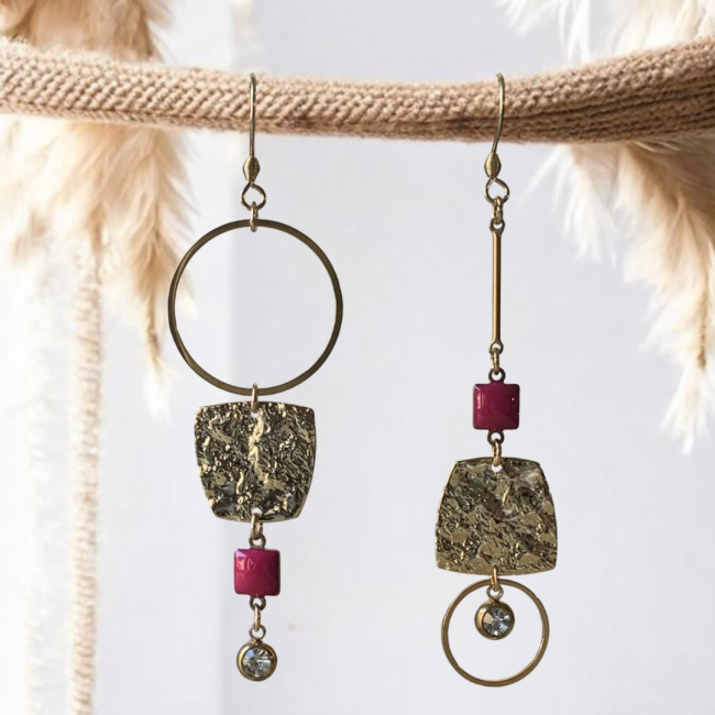 Boucles d'oreilles bohème chic asymétriques doré bordeaux et moutarde